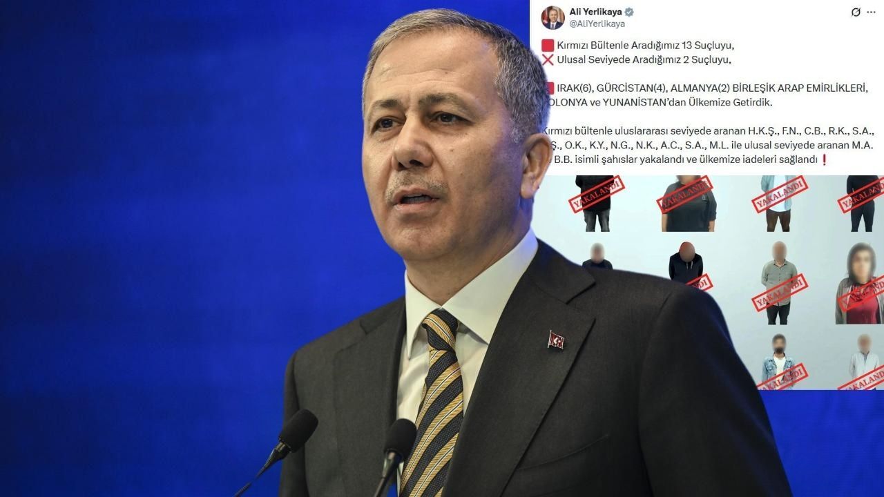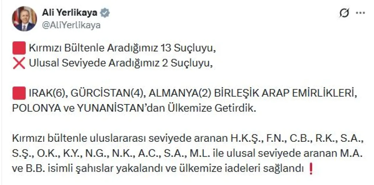 İçişleri Bakanı Ali Yerlikaya, yurt dışında firari bulunan suçluların yakalanmasına yönelik düzenlenen operasyonu sosyal medya hesabından paylaştı. Buna göre; 13'ü kırmızı bültenle uluslararası seviyede aranan toplam 15 suçlunun, Irak, Gürcistan, Almanya, Birleşik Arap Emirlikleri, Polonya ve Yunanistan'da yakalanarak Türkiye'ye iadeleri sağlandı. Emniyet Genel Müdürlüğü Interpol-Europol Daire Başkanlığı koordinesinde yürütülen çalışmalar sonucu, 'Kasten öldürme', 'Suç işlemek amacıyla kurulan örgüte üye olma', Nitelikli yağma', 'Cebir', 'Tehdit veya hile kullanarak kişiyi hürriyetinden yoksun kılma', 'Ruhsatsız ateşli silahlarla mermileri satın alma, taşıma, bulundurma' suçlarından kırmızı bültenle uluslararası seviyede aranan organize suç örgütü üyesi H.K.Ş. Birleşik Arap Emirlikleri'nde yakalandı.