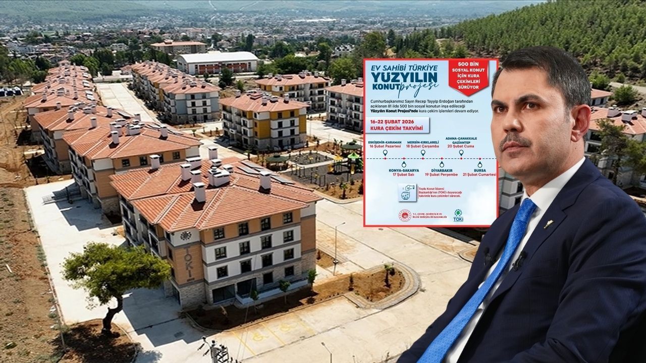 Murat Kurum, Türkiye genelinde 500 bin sosyal konutun inşa edileceği “Yüzyılın Konut Projesi” kapsamında 16-22 Şubat haftasının kura programını paylaştı. Toplu Konut İdaresi Başkanlığı (TOKİ) tarafından hayata geçirilen proje çerçevesinde kura çekimleri 29 Aralık 2025’te başlamıştı. 29 Aralık 2025-8 Şubat 2026 tarihleri arasında 58 ilde toplam 213 bin 451 sosyal konutun hak sahipleri noter huzurunda belirlendi. Süreç, 13 Şubat’ta Tekirdağ, Balıkesir ve Kocaeli’nde gerçekleştirilen kura çekimleriyle devam etti.