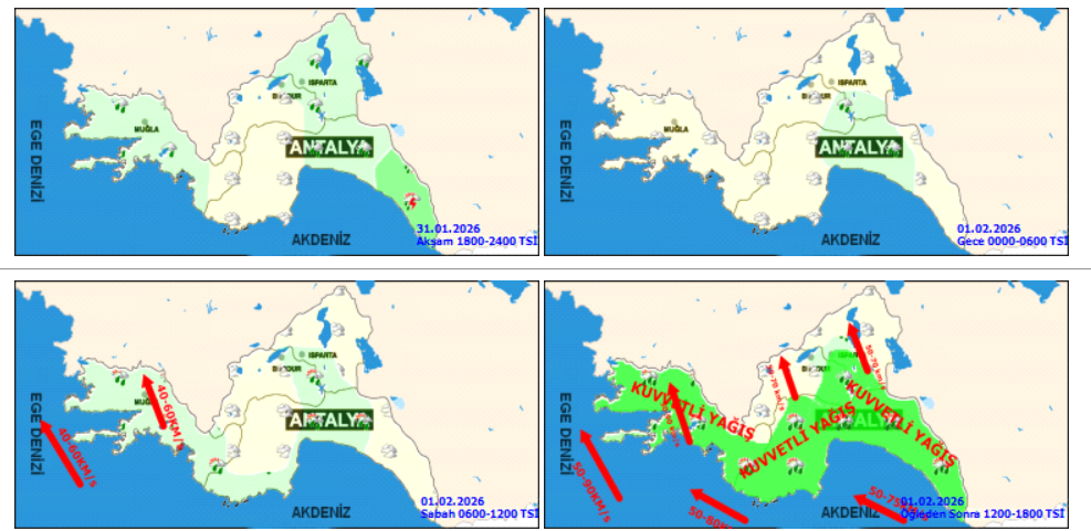 Yağışların Antalya ve Muğla genelinde ile Ispartanın ve Burdurun güneydoğu ilçelerinde yer yer ve zaman zaman kuvvetli ve şiddetli olması beklenmektedir. Denizlerde Rüzgarın güney ve doğu yönlerinden yer yer kuvvetli rüzgar ve fırtına ve kuvvetli fırtına şeklinde esmesi bekleniyor. Rüzgarın öğle saatlerinden sonra Muğla, Isparta ve Burdur çevrelerinde fırtına ve yer yer kuvvetli fırtına şeklinde esmesi bekleniyor