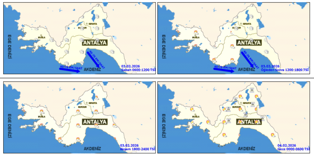 Meteoroloji Genel Müdürlüğü'nden alınan bilgilere göre Antalya ve ilçelerinde 3 Şubat Salı günü (Bugün) havanın parçalı ve çok bulutlu geçeceği tahmin ediliyor. İç kesimlerde gece ve sabah saatleri pus, yer yer sis hadisesi bekleniyor.