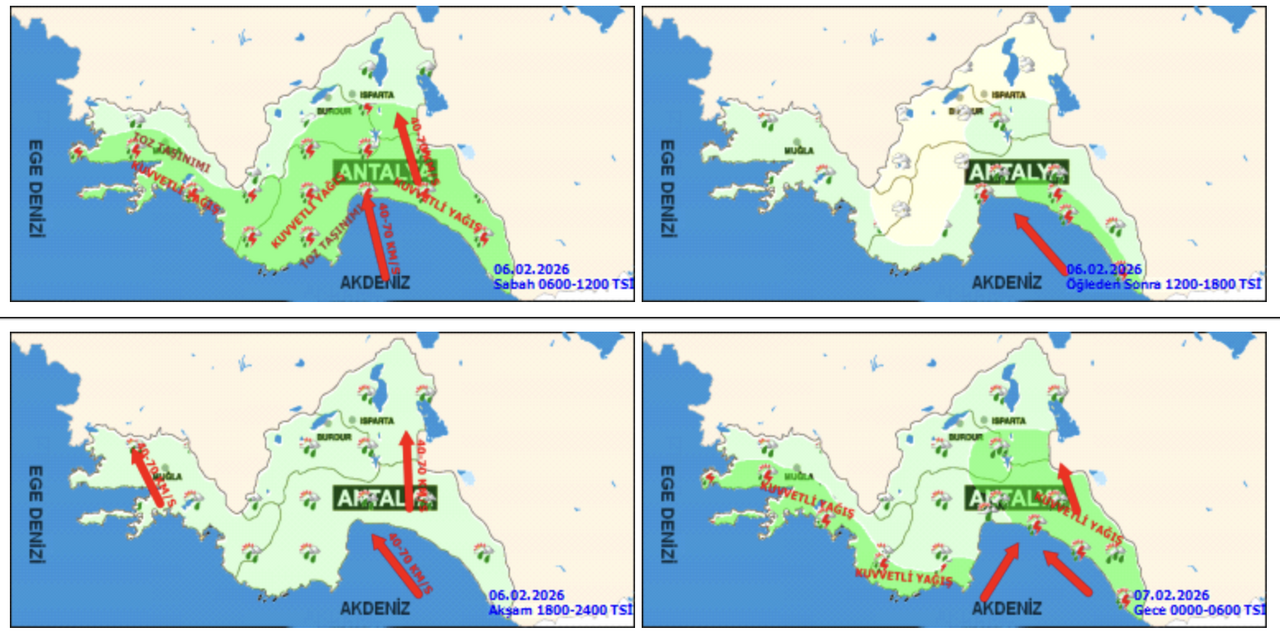 Meteoroloji yetkilileri tarafından yapılan uyarıda, yağışların Antalya, Muğla ve Burdur çevreleri ile Isparta’nın Sütçüler ilçesinde kuvvetli, yer yer çok kuvvetli olmasının beklendiği ifade edildi. Ayrıca rüzgarın Antalya çevrelerinde güney ve güneydoğu yönlerden kuvvetli, zaman zaman fırtına şeklinde esmesi öngörülüyor.