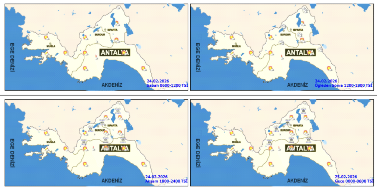 Meteoroloji Genel Müdürlüğü'nden alınan bilgilere göre Antalya ve ilçelerinde 24 Şubat Salı günü (Bugün) havanın parçalı az bulutlu zamanla yer yer çok bulutlu, gece ve sabah saatleri iç kesimler puslu, yer yer sisli geçeceği tahmin ediliyor.