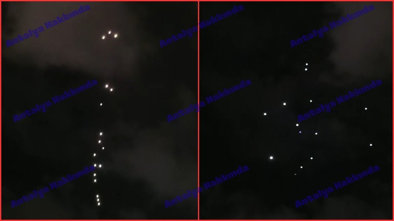 Antalya’da gece saatlerinde gökyüzünde beliren çok sayıda ışık hüzmesi vatandaşların dikkatini çekti. Bir anda ortaya çıkan, renk değiştiren ve kısa süre içinde kaybolan ışıklar çevrede bulunan kişilerde şaşkınlık yarattı. O anlar bir vatandaş tarafından cep telefonu kamerasıyla kaydedildi. Şaşkınlığını gizleyemeyen kadının tepkileri ise gündem oldu.