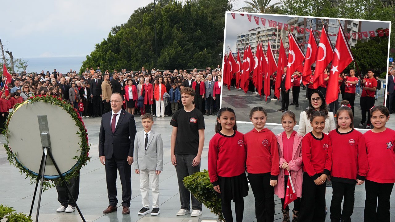 Tören kapsamında Antalya İl Milli Eğitim Müdürü Mehmet Yasin Eriş, bir öğrenci eşliğinde meydandaki Atatürk anıtına çelenk sundu.