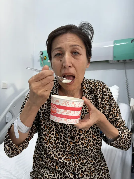 “60 kilodan 34 kiloya kadar düştüm. Bu kadar kilo verince kemiklerim de zayıfladı. Onkoloji doktorum hemen hastaneye alıp tedavimi yaptı bu süreçte. Şikayetlerimden dolayı üç kez endoskopi yapıldı. ‘Korkulacak bir şey yok. Ameliyat yeri düzgün. Her şey iyi’ dendi. Ananas suyu içmem önerildi. Her şeyi yiyebileceğim söylendi ama yediğim her şeyi çıkardığım için yemiyordum"