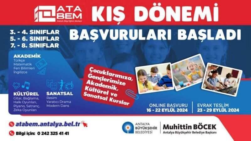 Kayıt işlemini tamamlayan öğrencilerin gerekli evraklarını 23-29 Eylül tarihleri arasında ilgili merkezlere teslim etmesi gerekiyor. Kış dönemi dersleri ise 30 Eylül Pazartesi günü başlayacak. ATABEM, bu kurslarla öğrencilerin hem okul derslerine destek olmayı hem de sosyal ve sanatsal becerilerini geliştirmeyi hedefliyor.
