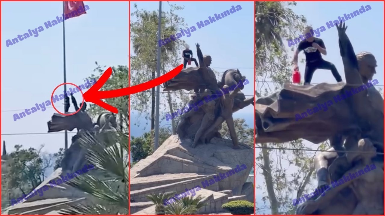 Antalya Cumhuriyet Meydanı’nda bulunan Mustafa Kemal Atatürk heykelinin üzerine çıkan bir şahıs, yanında bulunan benzinle kendini yakmaya çalıştı. Olay, çevrede bulunan vatandaşların dikkatini çekerken kısa sürede güvenlik güçleri bölgeye yönlendirildi.