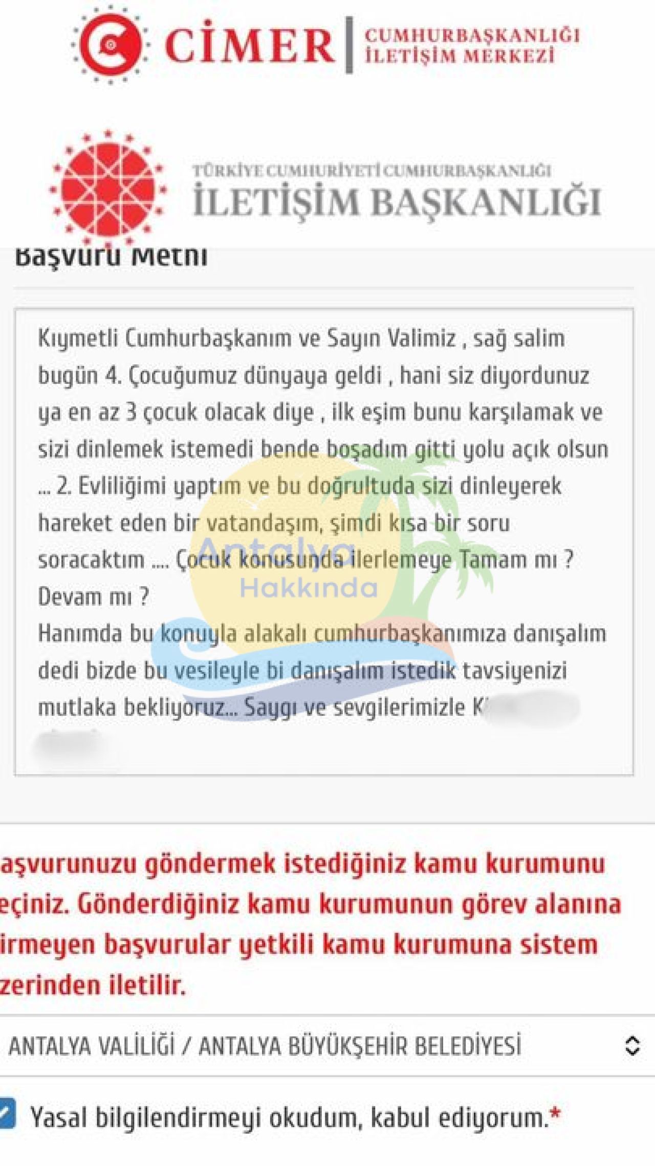 Antalya’da bir vatandaşın Cumhurbaşkanlığı İletişim Merkezi’ne (CİMER) yazdığı mesaj, sosyal medyada paylaşıldıktan sonra gündem oldu. Mesajda yer alan ifadeler kısa sürede çok sayıda kullanıcı tarafından paylaşıldı. Söz konusu mesajda vatandaş, Cumhurbaşkanı Recep Tayyip Erdoğan’ın daha önce dile getirdiği “en az 3 çocuk” tavsiyesini dikkate aldığını belirtti. CİMER'e yazdığı mesaj kısa sürede gündem oldu.