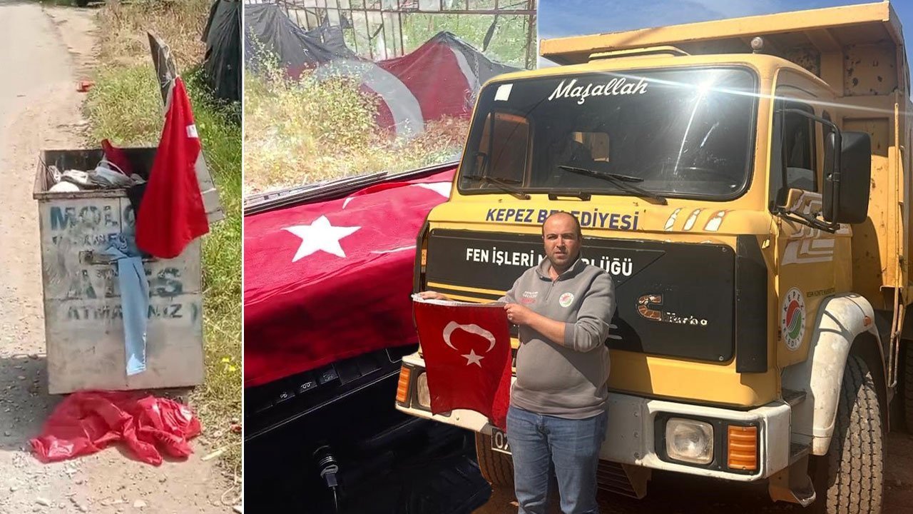 Durumu fark etmesinin ardından aracını yol kenarına çeken Acar, konteynerde bulunan bayrağı çıkararak temizledi. Daha sonra Türk bayrağını muhafaza altına alan belediye personeli, bayrağı kamyonunun ön konsoluna serdi.
