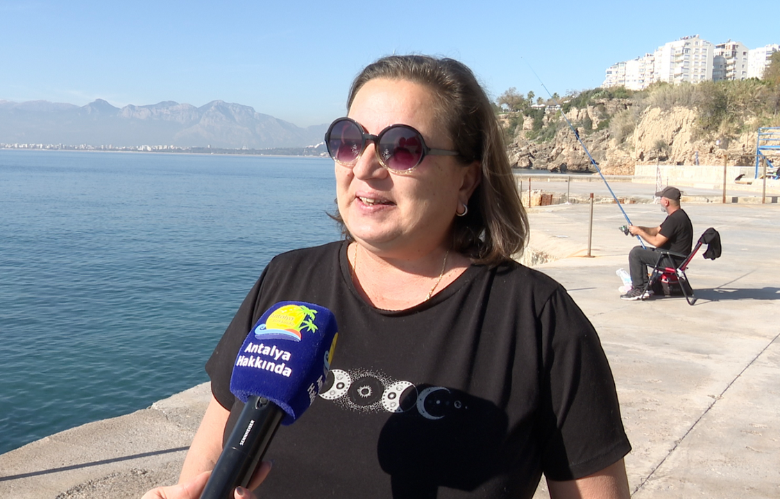 "Antalya'nın yazı hiçbir zaman için bitmez. Yani doğal şartlarda 300 gün güneşimiz var. Ama bu bazen daha uzun sürebiliyor. Gördüğünüz gibi bugün de buradayız. Denizimiz harika. Genelde yüzmeye de geliyoruz. Fakat bugün bir hava almaya geldim. Biraz böyle değişiklik olsun yine her zamanki gibi. Ama inanın ki yani şu an yüzenlere imreniyorum. Ve yarın tekrar yüzmeye geleceğim"