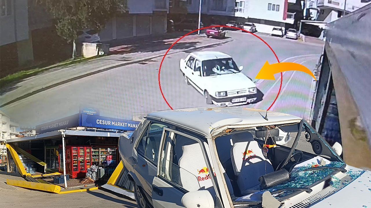 Güvenlik kamerasına saniye saniye yansıyan kazada, viraja hızlı girdiği görülen otomobilin çarpmanın ardından marketin kepenk ile dış kaplamasını düşürdüğü ve ardından yaklaşık 50-60 metre uzaklıkta durabildiği gözlendi. Görüntülerde üç tekerli bir motosikletin ise kazadan yaklaşık 7 saniye önce marketin önünden geçtiği görüldü. Kazada yaralanan olmazken, otomobil ve markette büyük hasar meydana geldi.