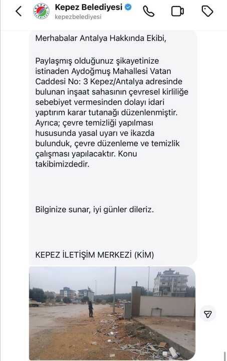 “Paylaşmış olduğunuz şikayetinize istinaden Aydoğmuş Mahallesi Vatan caddesi No:3 Kepez/Antalya adresinde bulunan inşaat sahasının çevresel kirliliğe sebebiyet vermesinden dolayı idari yaptırım karar tutanağı düzenlenmiştir. Ayrıca; çevre temizliği yapılması hususunda yasal uyarı ve ikazda bulunduk, çevre düzenleme ve temizlik çalışması yapılacaktır. Konu takibimizdedir.”
