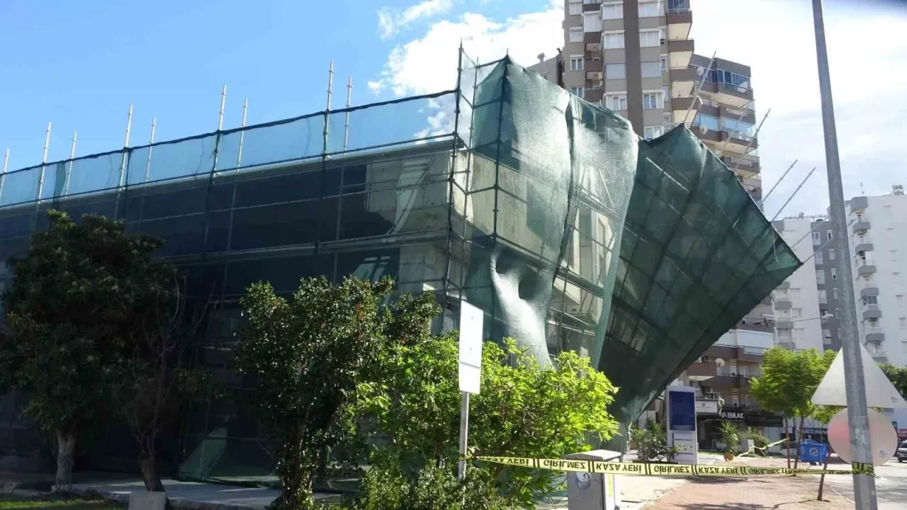 Antalya’da saatteki hızı 62 kilometreyi bulan fırtınaya dayanamayan inşaat iskelesi yerinden söküldü. Yol araç trafiğine kapatılırken, iskele iş makinesi yardımıyla yeniden sabitlendi.