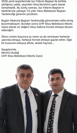 "Kıymetli Aksu Halkı, 2024 yerel seçimlerinde İsa Yıldırım Başkan ile birlikte çıktığımız yolda, seçimleri Aksu’da birinci parti olarak tamamladık. Bu süreç sonrası, İsa Yıldırım Başkan’ın takdirleriyle yaklaşık 1,5 yıldır Aksu Belediyesi Başkan Yardımcılığı görevini yürüttüm. Bugün itibarıyla Başkan Yardımcılığı görevimden istifa etmiş bulunmaktayım. Bundan sonra CHP Aksu Belediyesi Meclis Üyesi olarak siz değerli Aksu halkına hizmet etmeye devam edeceğim. Görev sürem boyunca oy veren ya da vermeyen herkesin yanında olmaya, herkese hizmet etmeye gayret ettim. Eğer bir kusurum olduysa affola, akıbet hayrola…"