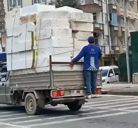 Olay, Alanya’nın Tosmur Mahallesi’nde meydana geldi. Seyir halindeki bir otomobil sürücüsü, inşaat malzemesi yüklü kamyonetin arkasına tutunmuş halde ayakta yolculuk yapan kişiyi cep telefonuyla kayda aldı. Görüntülerde, kamyonetin arka bölümünde bulunan kişinin, kasaya tutunarak trafikte seyahat ettiği anlar yer aldı.