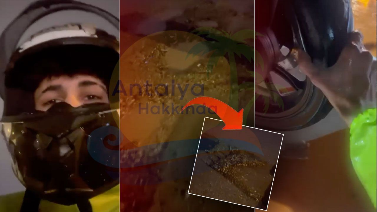 “Burası Kepez ilçesi Tansu Çiller Caddesi. Kuryelik yapıyorum. Biraz önce yoldaki çukura düştüm ve jantım yamuldu. Görmedim, yağmurda vizörüm kapalıydı. Lastiğim patladı, üstüm sırılsıklam. Bu işçiliği herkesin görmesini istiyorum. Borçlarımı ödemek için bu soğuk havada çalışıyorum, başıma bu olay geldi”