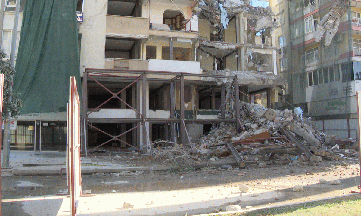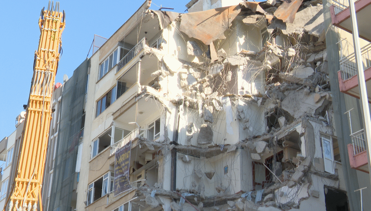 “Bundan 2-3 ay önce arkamda görmüş olduğunuz binanın yıkımı, daha doğrusu kolonları patladığında, bina sakinleri tarafımıza müracaat ederek kentsel dönüşüm konusunda bizden destek aldılar ve bu doğrultuda bizden bu binayı yapmamızı istediler. Geldiğimiz aşamada görüyorsunuz, arkamdaki binada bu aşamada yıkım gerçekleşiyor bugün”