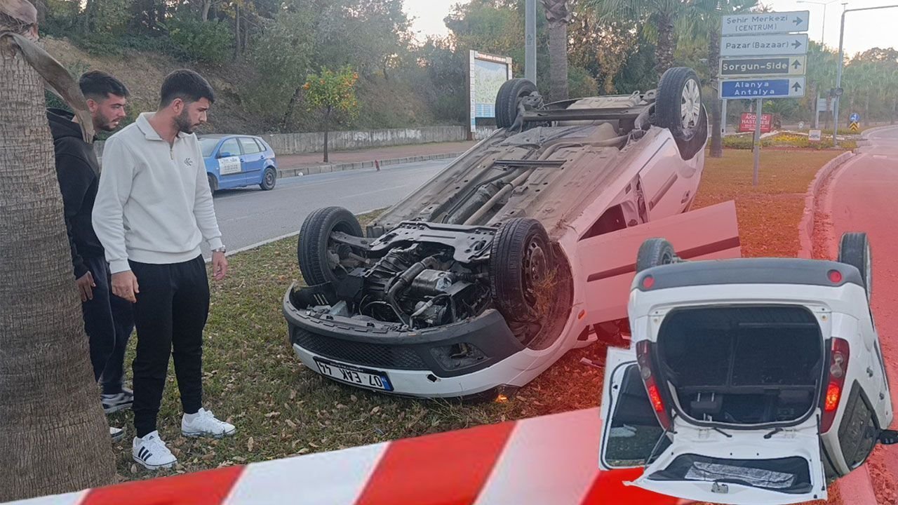 Antalya’da korkutan kaza! Refüje çarpıp ters dönen araçtan sağ kurtuldu!