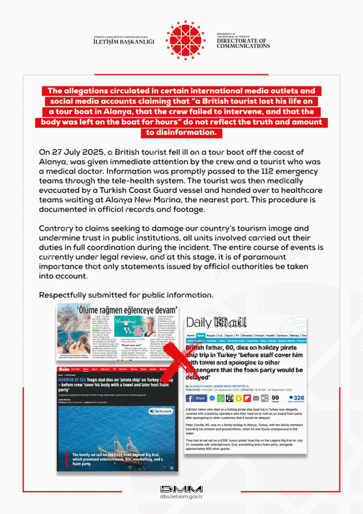 "Bazı uluslararası medya kuruluşlarında ve sosyal medya hesaplarında 'İngiliz bir turistin Alanya'da bir tur teknesinde hayatını kaybettiğini, mürettebatın müdahale etmediğini ve cesedin teknede saatlerce bırakıldığını' iddia eden iddialar gerçeği yansıtmıyor ve dezenformasyon anlamına geliyor"