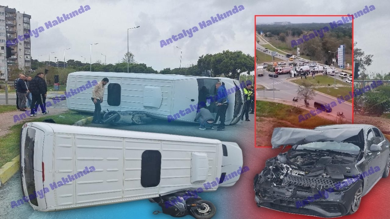 Kaza, Muratpaşa ilçesinde Kardeş Kentler Caddesi'ni Yaşar Sobutay Bulvarı'na bağlayan kavşak noktasında meydana geldi. Edinilen bilgiye göre, henüz belirlenemeyen bir nedenle meydana gelen kazaya; bir servis aracı, lüks bir otomobil ve bir motosiklet karıştı. Çarpışmanın şiddetiyle savrulan servis aracı, motosikletin üzerine devrildi. Kazanın ardından olay yerinde araç parçaları çevreye saçılırken, çevredeki vatandaşların ihbarı üzerine bölgeye çok sayıda ambulans, itfaiye ve polis ekibi sevk edildi.