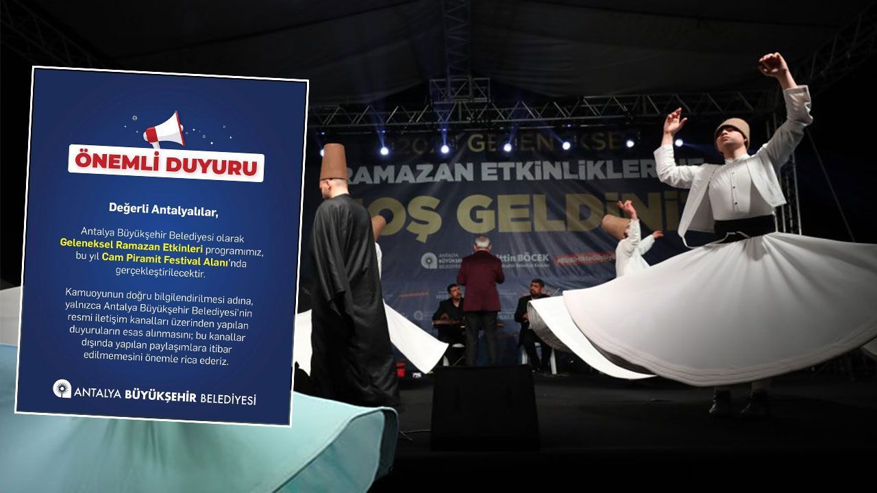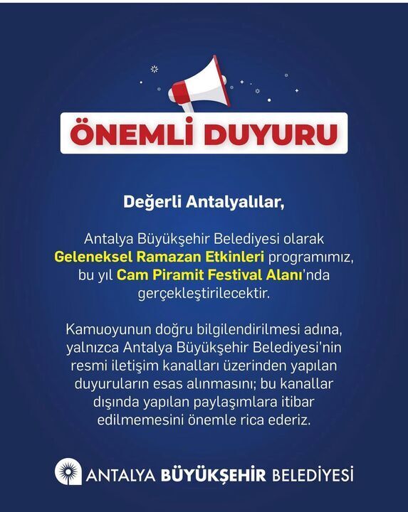 "Antalya Büyükşehir Belediyesi olarak Geleneksel Ramazan Etkinleri programımız, bu yıl Cam Piramit Festival Alanı'nda gerçekleştirilecektir. Kamuoyunun doğru bilgilendirilmesi adına, yalnızca Antalya Büyükşehir Belediyesi'nin resmi iletişim kanalları üzerinden yapılan duyuruların esas alınmasını; bu kanallar dışında yapılan paylaşımlara itibar edilmemesini önemle rica ederiz"