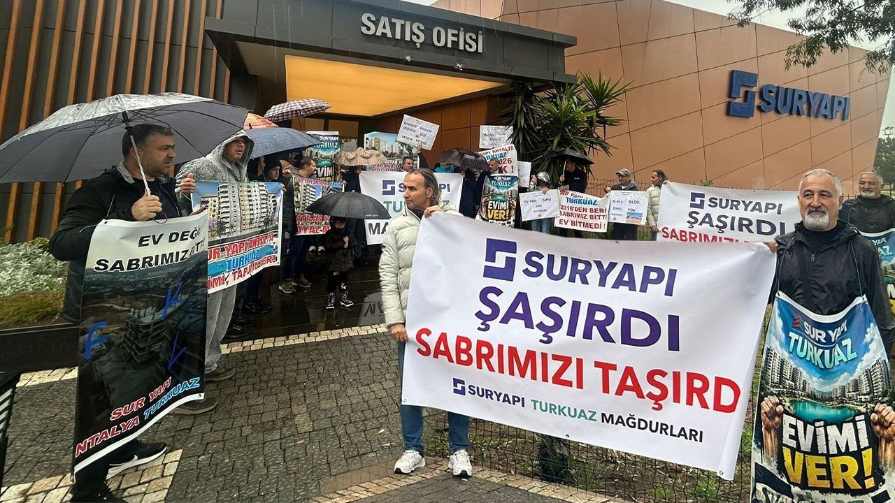 Antalya’nın Kepez ilçesinde Sur Yapı Antalya Satış Ofisi önünde yağmurlu havaya aldırış etmeden basın açıklaması yapan Sur Yapı Antalya ve Turkuaz Etapları Hak Sahipleri Platformu üyeleri, yıllardır yaşadıkları mağduriyetleri dile getirdi. Yağmurlu havaya rağmen alandan ayrılmayan hak sahipleri, sık sık sloganlar atarak kararlılık mesajı verdi.