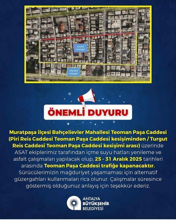 "Antalya’nın Muratpaşa ilçesi Bahçelievler Mahallesi Teoman Paşa Caddesi (Piri Reis Caddesi Teoman Paşa Caddesi kesişiminden / Turgut Reis Caddesi Teoman Paşa Caddesi kesişimi arası) üzerinde ASAT ekiplerimiz tarafından içme suyu hatları yenileme ve asfalt çalışmaları yapılacak olup, 25 - 31 Aralık 2025 tarihleri arasında Teoman Paşa Caddesi trafiğe kapanacaktır. Sürücülerimizin mağduriyet yaşamaması için alternatif güzergahları kullanmaları rica olunur. Çalışmalar süresince göstermiş olduğunuz anlayış için teşekkür ederiz."