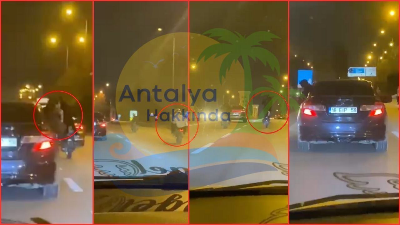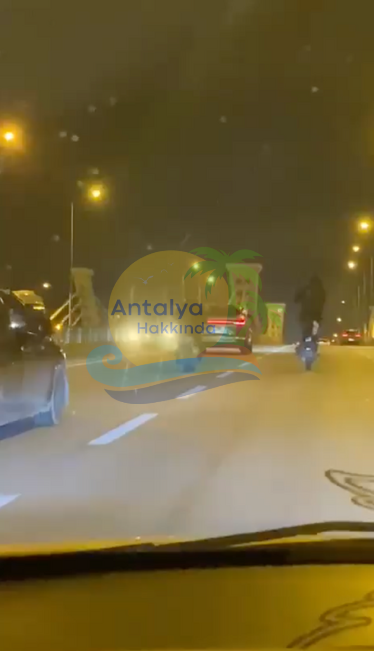 Antalya’da Gazi Bulvarı olarak bilinen D-400 kara yolu üzerinde dün akşam saatlerinde yaşanan olayda, 4 farklı motosiklet sürücüsünün trafikte tehlikeli hareketler sergilediği ve ön kaldırdığı anlar kameraya yansıdı. Görüntülerde, sürücülerin plakalarını sökerek yola çıktıkları ve yoğun araç trafiğine rağmen tehlikeli hareketler yaparak ilerlemeye devam ettikleri anlar yer aldı. Ayrıca aynı güzergahta seyir eden bir otomobil içerisinden sarkan 2 kişi de dikkatlerden kaçmadı.