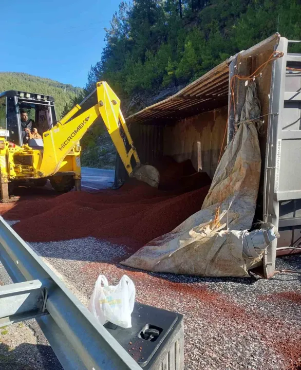 Mustafa K. yönetimindeki 68 KE 646 plakalı peyzaj malzemesi yüklü TIR, Akseki– Manavgat kara yolunda virajı alamayarak devrildi.
