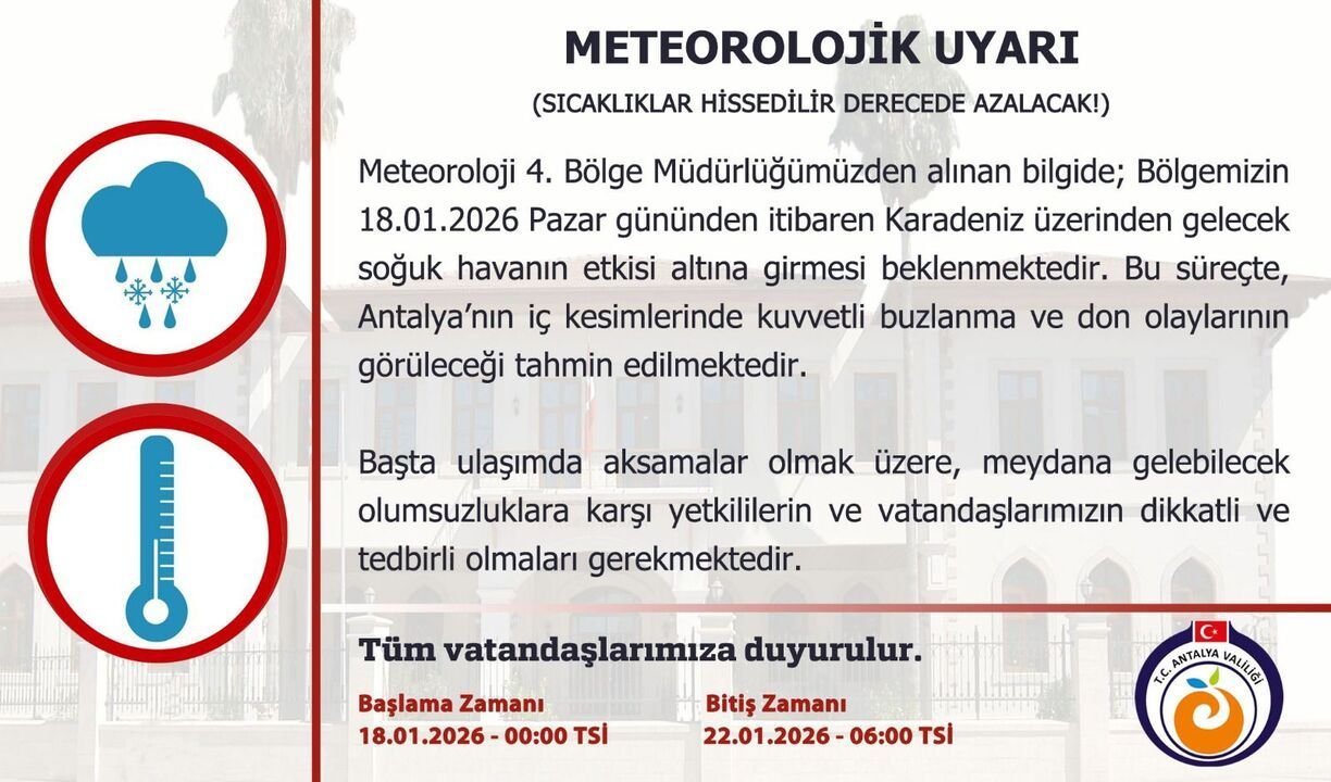 Meteoroloji 4. Bölge Müdürlüğü’nden alınan bilgilere göre, 18 Ocak 2026 Pazar günü itibarıyla Karadeniz üzerinden gelen soğuk hava dalgasının Antalya genelinde etkili olması bekleniyor. Hava sıcaklıklarının hissedilir derecede azalacağı, özellikle gece ve sabah saatlerinde soğuğun daha belirgin olacağı tahmin ediliyor.