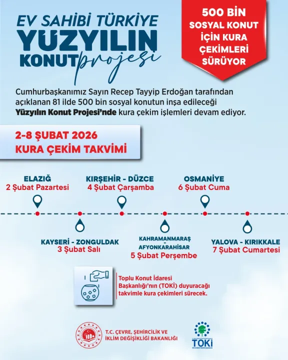 Toplu Konut İdaresi (TOKİ) Başkanlığı'nın hayata geçirdiği 'Yüzyılın Konut Projesi'nin kura çekimlerinde 5 hafta geride kaldı. 29 Aralık 2025'te başlayan kura süreci, 31 Ocak (dün) 10 bin 385 konutun kura çekimiyle devam etti. 29 Aralık 2025-31 Ocak 2026 tarihleri arasında, Adıyaman, Şırnak, Hakkari, Siirt, Van, Mardin, Ağrı, Batman, Iğdır, Bitlis, Kars, Muş, Ardahan, Antalya, Bingöl, Tunceli, Gümüşhane, Bayburt, Artvin, Rize, Erzurum, Malatya, Erzincan, Şanlıurfa, Trabzon, Tokat, Amasya, Manisa, Sivas, Kastamonu, Aydın, Giresun, Kilis, Sinop, Niğde, Ordu, Aksaray, Karabük, Samsun, Nevşehir ve Bartın’da kuralar çekildi. Böylece 41 ilde toplam 144 bin 258 sosyal konutun hak sahipleri noter huzurunda belirlenmiş oldu.