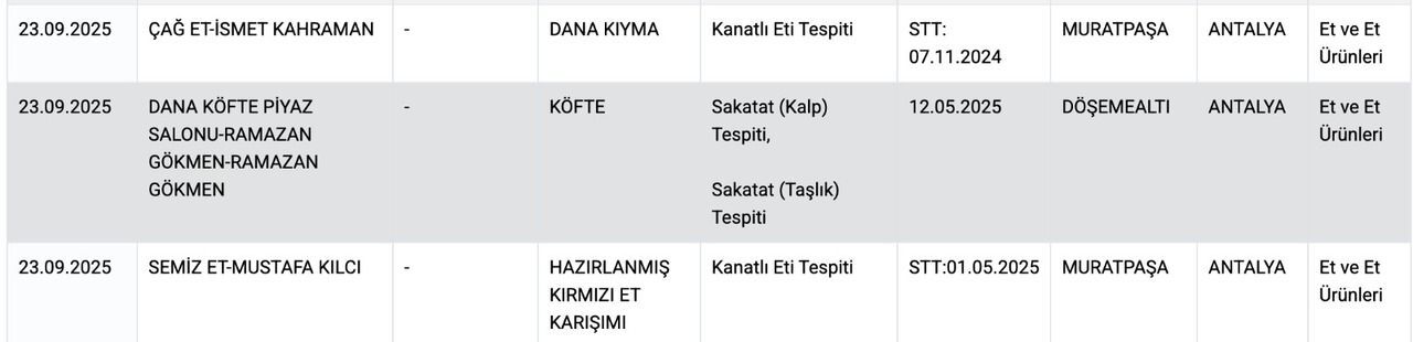 Tarım ve Orman Bakanlığı, taklit-tağşiş yapılan ve sağlığı tehlikeye düşürebilecek gıdalar listesini güncelledi. Listeye yeni ürünler eklendi. Bakanlığın açıkladığı listede özellikle Antalya’nın Muratpaşa ve Döşemealtı ilçesinde faaliyet gösteren bazı firmaların ürünlerinde ciddi ihlaller tespit edildi. Denetimler sonucunda dana kıymada, kanatlı eti, köftede sakatat (kalp -taşlık) ve hazırlanmış kırmızı et karışımda da da kanatlı eti tespit edildi.
