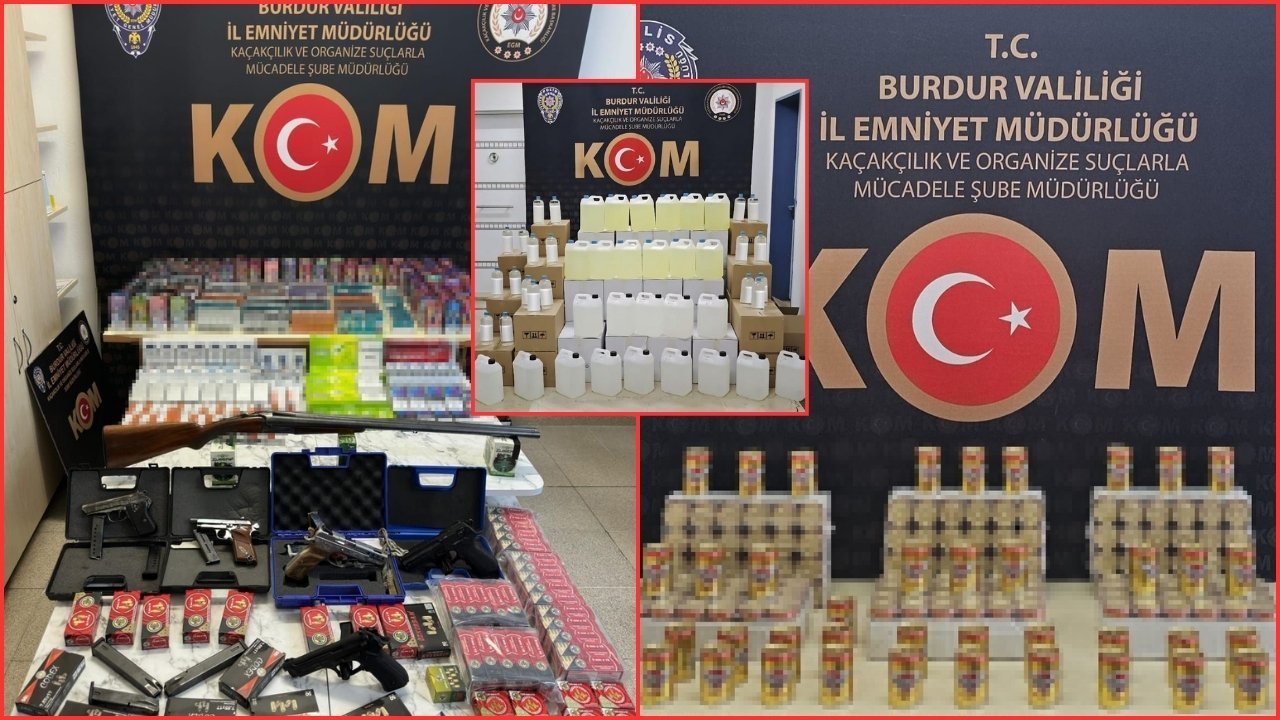 Burdur Cumhuriyet Başsavcılığı koordinesinde yürütülen çalışmalar kapsamında, Kaçakçılık ve Organize Suçlarla Mücadele Şube Müdürlüğü ekipleri harekete geçti. Kaçakçılıkla Mücadele Kanunu ve Ateşli Silahlar Hakkında Kanun'a muhalefet ettikleri belirlenen şahıslara yönelik düzenlenen operasyonlarda, suç unsurlarının bulunduğu adreslere baskınlar yapıldı. Emniyet güçlerinin titizlikle yürüttüğü aramalar sonucunda, suç şebekelerine ve kaçakçılık faaliyetlerine darbe vuruldu.