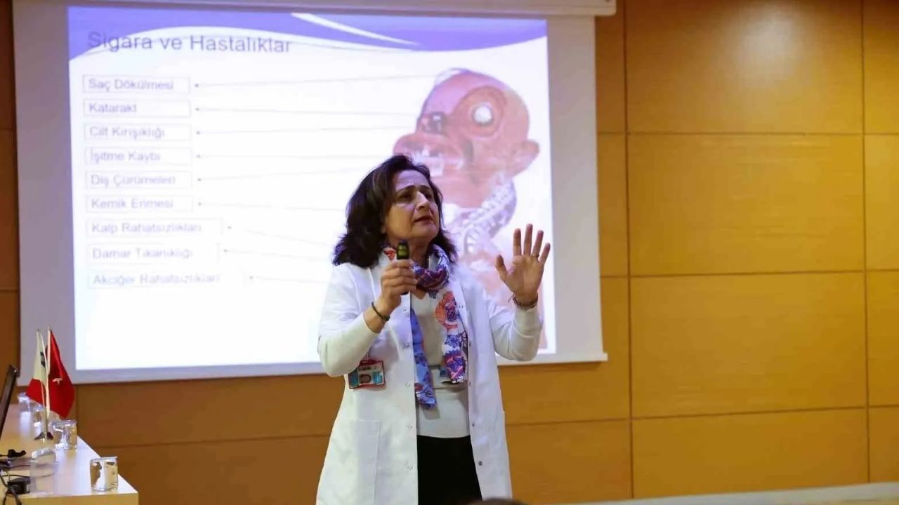 Antalya Büyükşehir Belediyesi Hizmet Binası’nda gerçekleşen eğitimde Antalya İl Sağlık Müdürlüğü Şehit Doktor Atila Nizam, Muratpaşa Sağlıklı Hayat Merkezi sorumlusu Zeynep Turan eğitim verdi. Sigaranın zararları hakkında bilgi veren Turan,