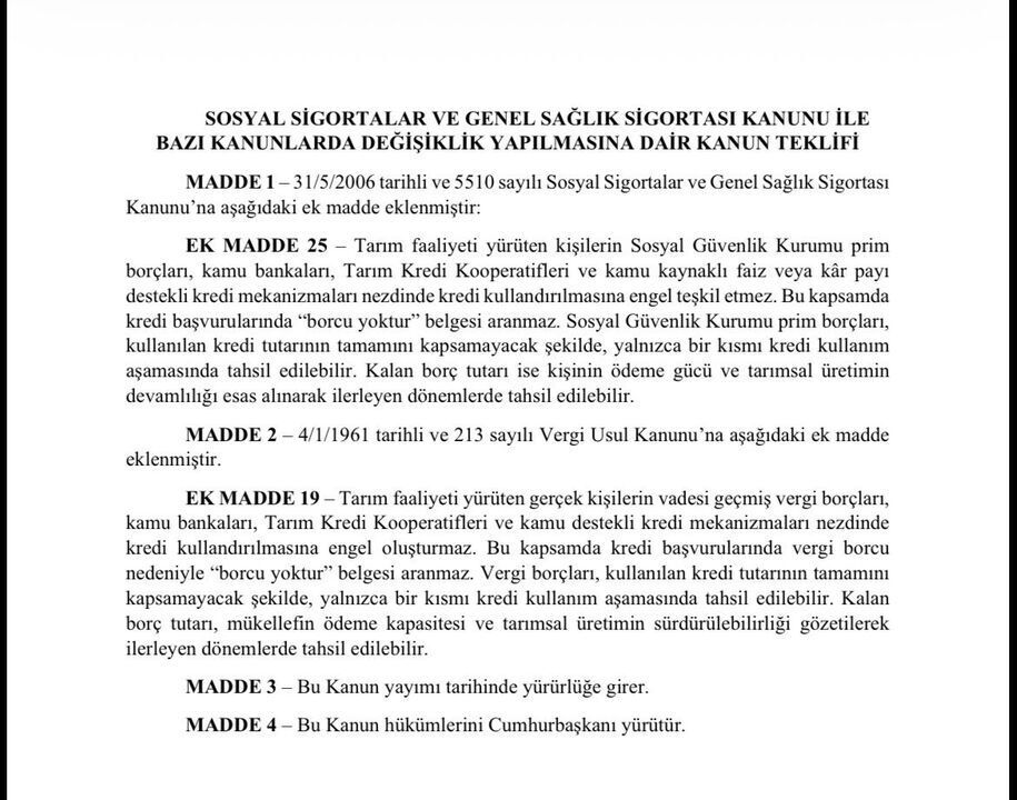 Teklif kapsamında, tarımsal faaliyette bulunan çiftçilerin SGK prim borçları ve vergi borçlarının kredi kullanımında mutlak engel sayılmaması öngörülüyor. Kredi başvurularında aranan “borcu yoktur” şartının kaldırılması hedeflenirken, mevcut borçların üretimi sekteye uğratmayacak şekilde kısmen ve zamana yayılarak tahsil edilmesi amaçlanıyor.