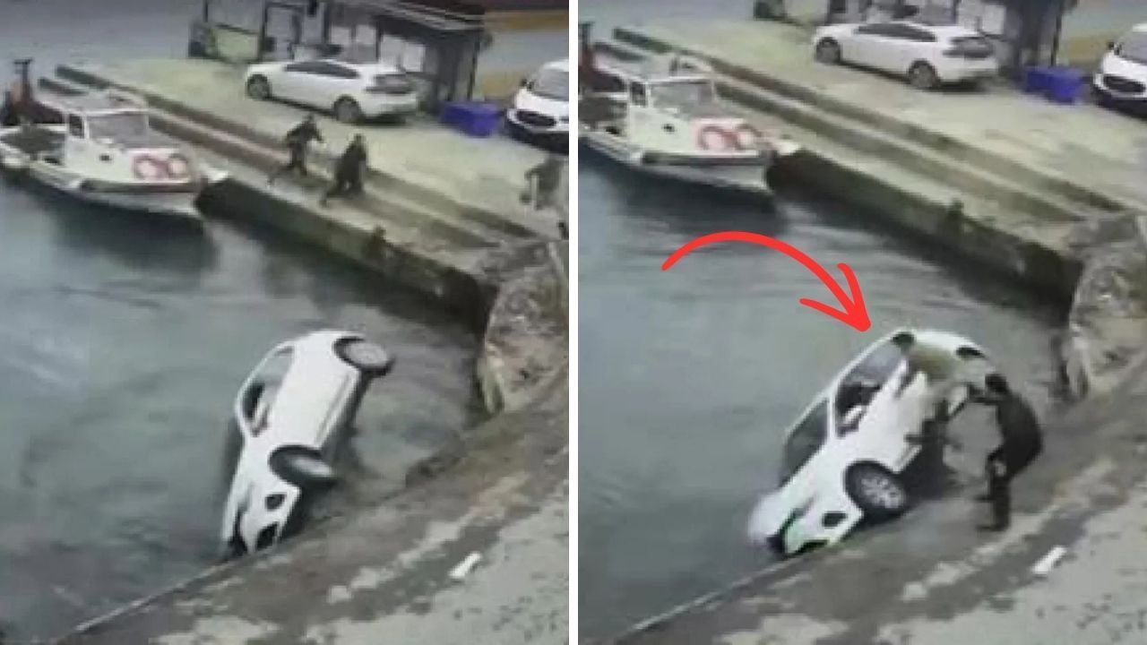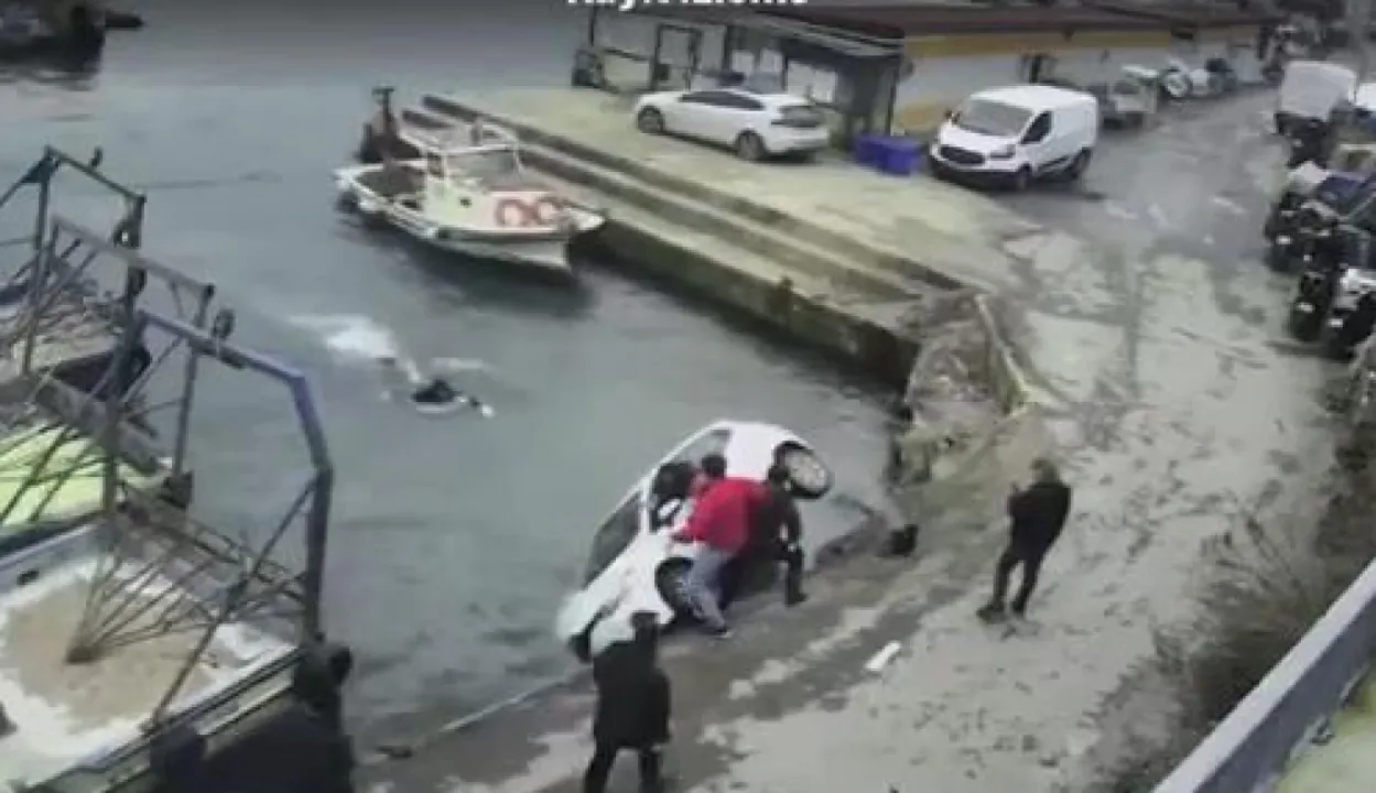 Kaza anı güvenlik kamerasına yansıdı. Görüntülerde, seyir halindeki otomobilin denize düştüğü ardından teknedekilerin koşarak geldiği görülüyor. Hareket halindeki teknedeki bir kişi de yüzerek otomobilin yanına geliyor.