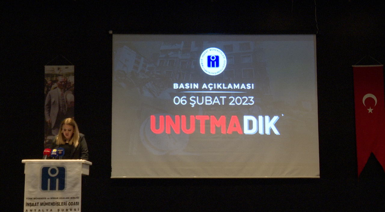TMMOB’a bağlı İnşaat Mühendisleri Odası Antalya Şubesi tarafından, 11 ilde büyük yıkıma yol açan 6 Şubat depremlerinin 3’üncü yılı dolayısıyla anma programı düzenlendi. Programın açılış konuşmasını İMO Antalya Şubesi Yönetim Kurulu Üyesi Ali Erman Aydın yaptı. Anma programında konuşan Yönetim Kurulu Üyesi Neslihan Başar, depremlerde yaşanan ağır can kayıplarının nedenine dikkat çekerek,