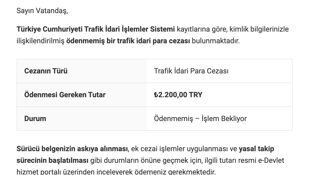 Dolandırıcıların hazırladığı sahte ekranda, Türkiye Cumhuriyeti e-Devlet Kapısı tasarımına benzer bir arayüz kullanılıyor. Mesajda, Trafik İdari İşlemler Sistemi kayıtlarına göre kişinin ödenmemiş bir trafik cezası olduğu belirtiliyor ve “ödenmesi gereken tutar” kısmında genellikle belirli bir rakam yer alıyor. Görselde yer alan örnekte ise vatandaşlardan 2.200 TL tutarında trafik idari para cezası olduğu iddia ediliyor.