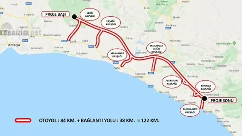 Ulaştırma ve Altyapı Bakanı Abdulkadir Uraloğlu, Antalya- Alanya Otoyolu’nun yapımıyla ilgili önemli açıklamalarda bulundu. Ekim ayında sözleşmesi imzalanan proje, yakın zamanda başlayacak temel atma töreniyle hayata geçirilecek. Toplam 122 kilometre uzunluğundaki otoyol, 84 kilometre ana yol ve 38 kilometre bağlantı yollarından oluşacak.