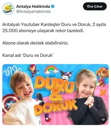 Antalya’da yaşayan Duru ve Doruk kardeşler, YouTube’da gösterdikleri hızlı yükselişle dikkatleri üzerine çekti. Sadece 2 ay gibi kısa bir sürede 25.000 aboneye ulaşan ikili, yerel sosyal medya camiasında adeta rekor tazeledi.