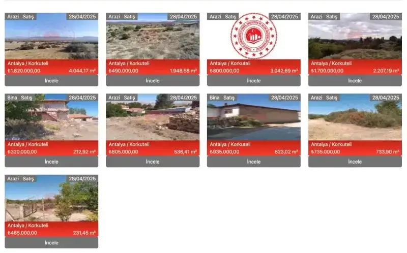 Satışa çıkan 1 bina ve 8 arazi Korkuteli ilçesinde yer alıyor.