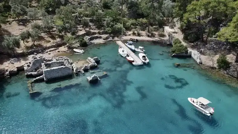 Eski bir antik kentin kalıntılarıyla iç içe olan bu koy, tarihi ve doğayı bir arada sunar.