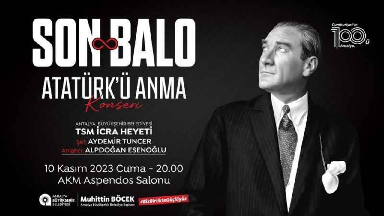 ANTALYA Büyükşehir Belediyesi, ölümünün 85'inci yılında Ulu Önder Gazi Mustafa Kemal Atatürk'ü 'Son Balo' ile anacak. Şef Aydemir Tuncer yönetimindeki Türk Sanat Müziği İcra Heyeti'nin gerçekleştireceği Atatürk'ü Anma Konserinde son baloda çalınan şarkılar seslendirilecek.