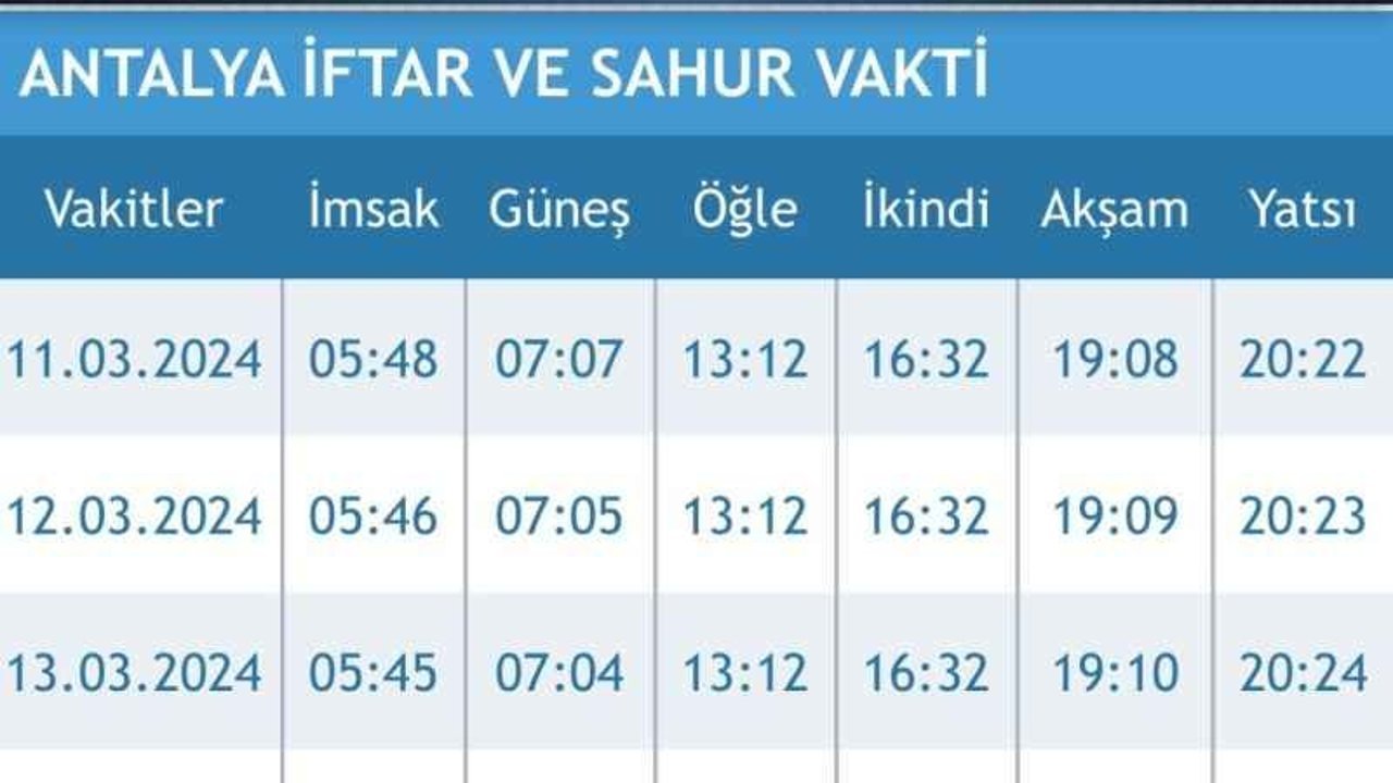 Antalya iftar vakti için 30 günlük iftar saatleri bu sayfada yayınlandı. Ramazan ayının bereketinden faydalanmak, Yüce Allah'ın rızasını kazanmak için oruç tutacağımız 11 Ayın Sultanı geldi çattı! Sahur ile iftar saati arasını oruçla geçirerek sabrı öğrendiğimiz, iftardan sahura değin şükrü tattığımız bu kıymetli ayda ibadetle ve duayla Yüce Allah'a sığınacağız. Bu noktada oruçlarımızı açacağımız mübarek ayda 2024 Ramazan İmsakiyesi yol gösterici olacak.