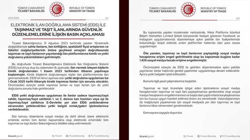 Ticaret Bakanlığı, ikinci el araç satış galerileri ve gayrimenkul danışmanlarına yönelik önemli bir uyarıda bulundu. Bakanlık, sosyal medya platformlarında (Facebook, Instagram vb.) ilan paylaşmanın yasaklandığını duyurdu. Yeni düzenlemeye göre, sadece taşınmaz ve taşıt sahipleri, birinci ve ikinci derece yakınları ya da yetki belgeli emlak ve galeri işletmeleri ilan verebilecek.