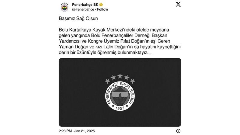 Fenerbahçe, Bolu Fenerbahçeliler Derneği Başkan Yardımcısı Rıfat Doğan'ın eşi Ceren Yaman Doğan ve kızı Lalin Doğan'ın da hayatını kaybettiğini açıkladı.
