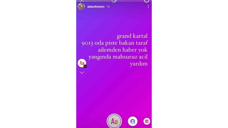 Acı haberden önce Sözcü yazarı Nedim Türkmen'in kızı Alya Türkmen’in sosyal medya üzerinden yaptığı paylaşımda, "Grand Kartal 9013 oda, piste bakan taraf. Ailemden haber yok, yangında mahsuruz. Acil yardım!" ifadeleriyle yardım çağrısı yürekleri burktu.