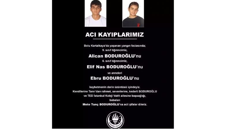ODTÜ Koleji'nden yapılan açıklamada, Bolu Kartalkaya kayak merkezinde çıkan otel yangınında 3'üncü sınıf öğrencisi Kemal Tokcan ve babası Can Tokcan ile ana sınıfı öğrencisi Atlas Kaan Tokcan ve babası Atil Enis Tokcan'ın hayatını kaybettiği bildirildi.