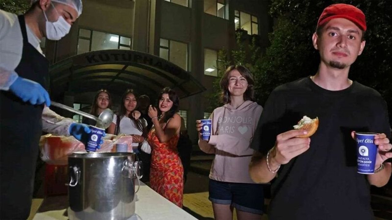 Antalya Büyükşehir Belediyesi’nin sınav dönemlerinde üniversite öğrencileri için gerçekleştirdiği ücretsiz çorba ikramı geleneğe dönüştü. Her vize ve final döneminde Akdeniz Üniversitesi öğrencilerine yapılan çorba ikramı, bu sınav döneminde de devam ediyor. Büyükşehir Belediyesi Sosyal Yardımlar Şube Müdürlüğü ekipleri, öğrencilere Merkez Kütüphanesi önünde 22.00-23.00 saatleri arasında sıcak çorba dağıtımı yapıyor.