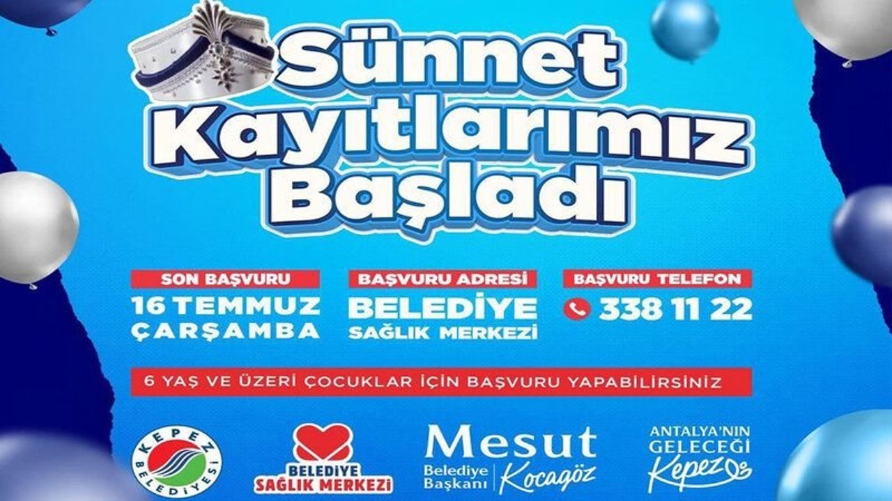 Antalya’nın Kepez ilçesinde, Kepez Belediyesi tarafından geleneksel olarak düzenlenen sünnet organizasyonu için kayıtlar başladı. Aileler, 6 yaş ve üzeri çocuklarını ücretsiz olarak sünnet ettirmek için 16 Temmuz’a kadar Kepez Belediyesi Sağlık Merkezi’ne başvurabilecek.